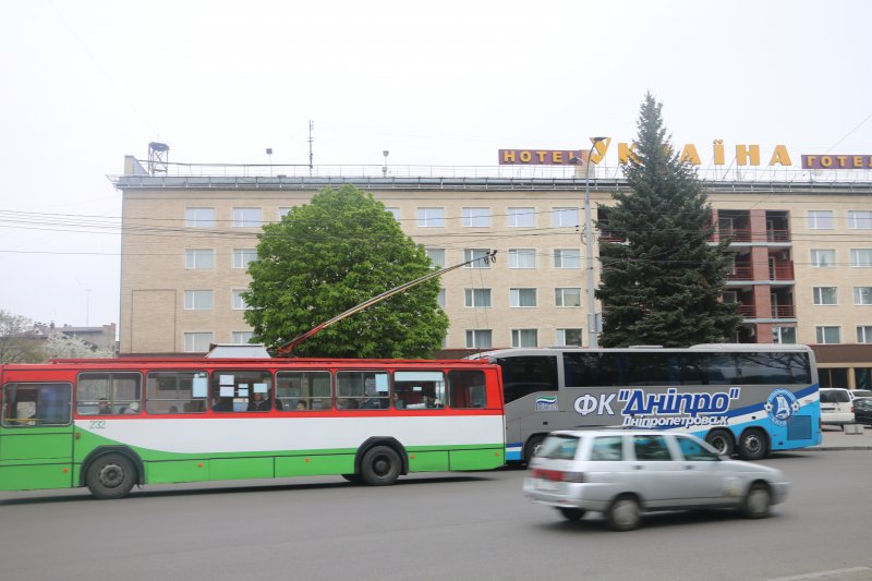 На фото автора: луцький тролейбус обганяє стоячий автобус «Дніпра».