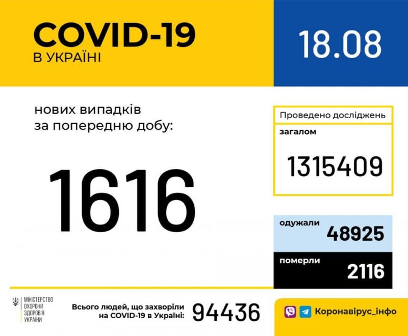 18 серпня (станом на 9:00) в Україні 94 436 лабораторно підтверджених випадків COVID-19, з них 2116 летальних, 48 925 пацієнтів одужало. За добу зафіксовано 1616 нових випадків. Загалом проведено 1 315 409 тестувань методом ПЛР. Усього за добу одужав 761 пацієнт.