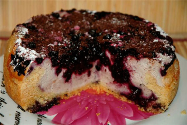 150 г масла, 300 г цукру, 300 г чорниць, 5 яєць, 200 г борошна, 600 г сиру, 100 г крохмалю, ванілін, розпушувач, цукрова пудра.