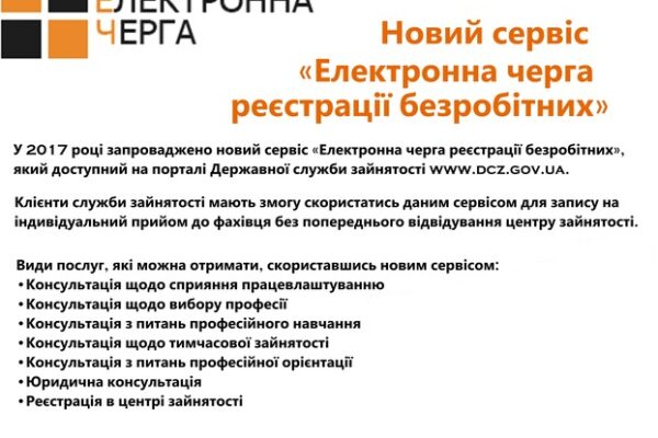 В мережі Інтернет запроваджено новий сервіс «Електронна черга реєстрації безробітних», який доступний на порталі Державної служби зайнятості www.dcz.gov.ua.