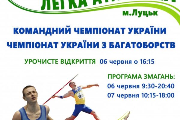 6-7 червня у Луцьку на стадіоні «Авангард» відбудуться командний чемпіонат України з легкої атлетики та чемпіонат України з багатоборств.