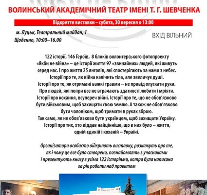 30 вересня о 13.00 у Волинському академічному обласному українському музично-драматичному театрі імені Т. Г. Шевченка відбудеться презентація фотовиставки та книги «Якби не війна».