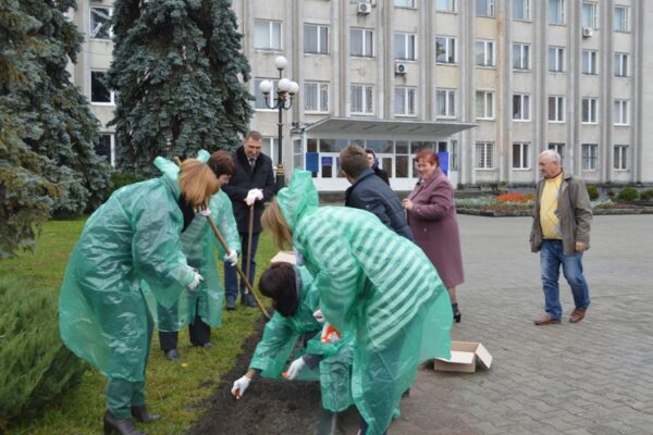Мер Ковеля Олег Кіндер разом з працівниками виконавчого комітету та секретарем міськради Вірорю Федоськ під час обідньої перерви висадив цибулини тюльпанів на площі Героїв Майдану.