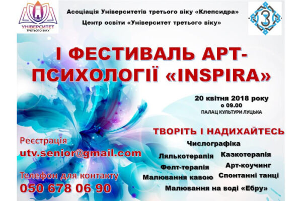 20 квітня 2018 року за підтримки Луцької міської ради вперше в Луцьку відбудеться ФЕСТИВАЛЬ АРТ-ПСИХОЛОГІЇ «INSPIRA».