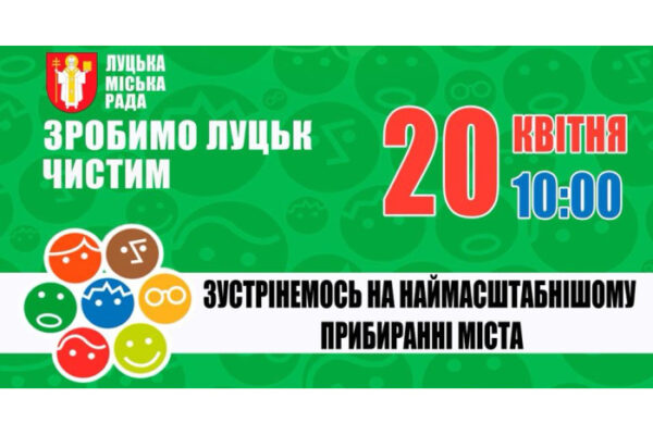 20 квітня знову відбудеться загальноміська акція «Зробимо Луцьк чистим». Запрошуємо усіх охочих долучитися до весняного прибирання нашого міста. Лише спільними зусиллями зробимо Луцьк чистішим та привабливішим. Приєднуйся до лав небайдужих!