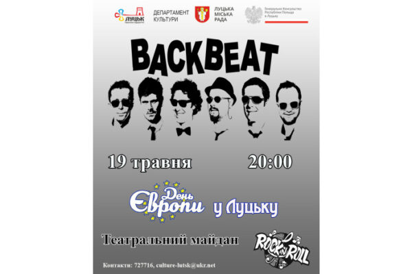 19 травня на Театральному майдані міста Луцька за сприяння Луцької міської ради та Генерального консульства Республіки Польща в Луцьку відбудеться концерт польського гурту “BACKBEAT” (м. Люблін).