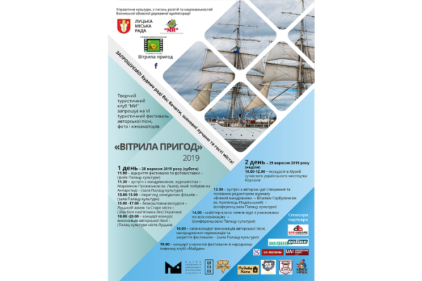 28-29 вересня у Луцьку відбудеться VІ туристичний фестиваль авторської пісні, фото- та кіноаматорів «Вітрила пригод» 2019.