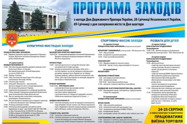 З 23 по 25 серпня у Нововолинську відбудеться ряд заходів з нагоди Дня Державного Прапора України, 28-ї річниці Незалежності України,69-ї річниці з дня заснування міста та Дня шахтаря.