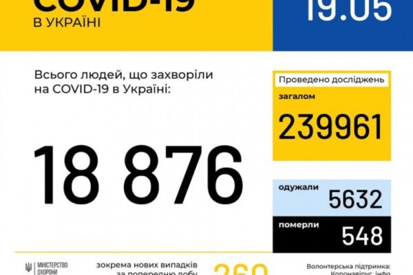 За даними ЦГЗ, станом на 9:00 19 травня в Україні 18876 лабораторно підтверджених випадків COVID-19, з них 548 летальних, 5632 пацієнти одужало. За добу зафіксовано 260 нових випадків.