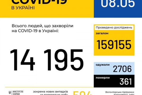 За даними ЦГЗ, станом на 9:00 8 травня в Україні 14195 лабораторно підтверджених випадків COVID-19, з них 361 летальний, 2706 пацієнтів одужало. За добу зафіксовано 504 нові випадки.