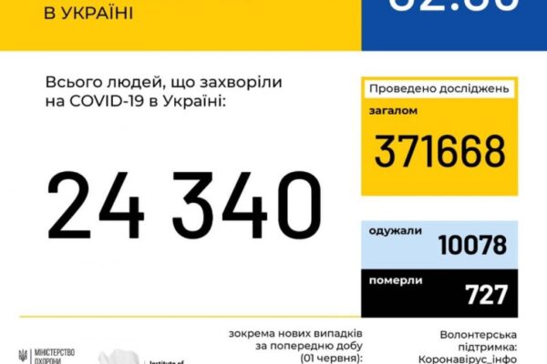За даними ЦГЗ, станом на 9:00 02 червня в Україні 24340 лабораторно підтверджених випадків COVID-19, з них 727 летальних, 10078 пацієнтів одужало. За добу зафіксовано 328 нових випадків.