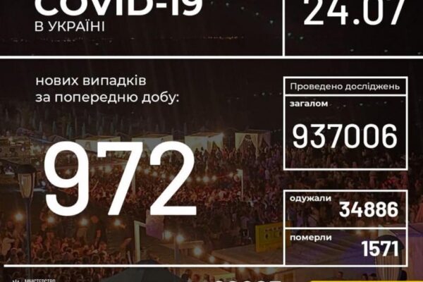 24 липня (станом на 9:00) в Україні 62 823 лабораторно підтверджені випадки COVID-19, з них 1571 летальний, 34 886 пацієнтів одужало. За добу зафіксовано 972 нові випадки. Загалом проведено 937 006 тестувань методом ПЛР. Усього за добу одужало 886 пацієнтів.