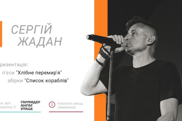 У неділю 19 липня в Гармидер ангар-stage (вул. Залізнична, 9) відбудеться творчий вечір відомого українського письменника Сергія Жадана. Зустріч запланована в рамках дофестивальних заходів «Фронтери». Початок о 16 год.