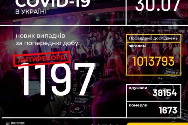 30 липня (станом на 9:00) в Україні зареєстровано 68 794 лабораторно підтверджені випадки COVID-19, з них 1673 летальні, 38 154 пацієнти одужало.