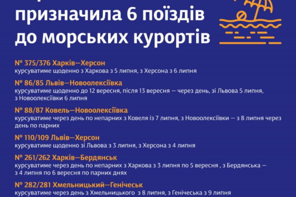 Укрзалізниця відкрила продаж квитків ще на шість поїздів далекого сполучення. Зокрема, з цього тижня відновлять курсування поїзди до Херсона, Бердянська та Новоолексіївки.
