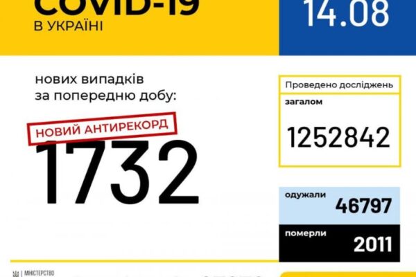 14 серпня (станом на 9:00) в Україні зафіксовано 87 872 лабораторно підтверджені випадки COVID-19, з них 2011 летальні, 46 797 пацієнтів одужало. За добу зафіксовано 1732 нові випадки. Загалом проведено 1 252 842 тестування методом ПЛР. Усього за добу одужав 581 пацієнт.