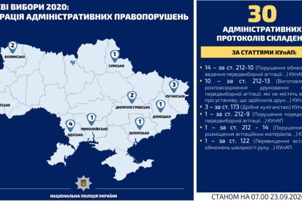Усього впродовж доби до поліції надійшло 51 заява та повідомлення, пов’язаних з порушеннями виборчого законодавства. Найбільше повідомлень зафіксовано в Івано-Франківській – 18, у Кіровоградській – 12, у Дніпропетровській – 8, у Чернігівській – 3, по 2 – у Волинській, Тернопільській, Запорізькій та Полтавській, по 1 – у Сумській та Черкаській областях.
