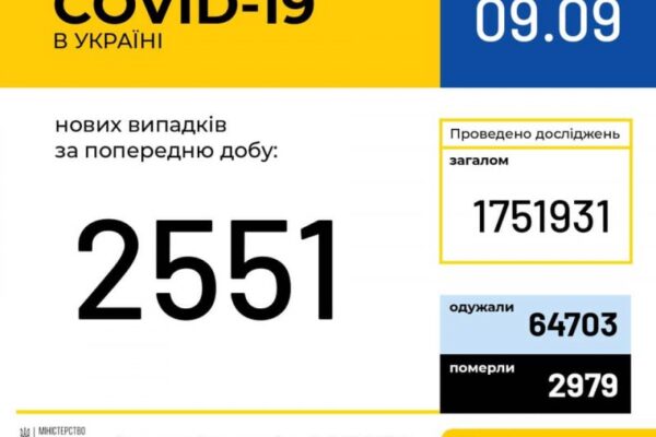 9 вересня (станом на 9:00) в Україні 143 030 лабораторно підтверджених випадків COVID-19, з них 2 979 летальних, 64 703 пацієнти одужали. За добу зафіксовано 2 551 новий випадок.