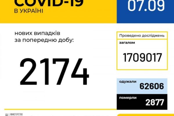 7 вересня (станом на 9:00) в Україні 138 068 лабораторно підтверджених випадків COVID-19, з них 2 877 летальних, 62 606 пацієнтів одужали. За добу зафіксовано 2 174 нових випадків.