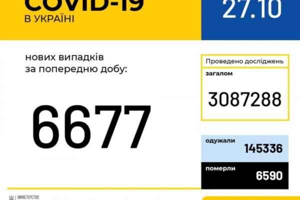 27 жовтня (станом на 9:00) в Україні 355 601 лабораторно підтверджений випадок COVID-19, із них 6 590 летальних, 145 336 пацієнтів одужали. За добу зафіксовано 6 677 нових випадків. Загалом проведено 3 087 288 тестувань методом ПЛР. За добу одужали 2 799 пацієнтів.