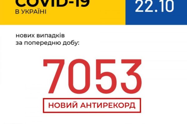 22 жовтня (станом на 9:00) в Україні 322 879 лабораторно підтверджених випадків COVID-19, із них 6 043 летальних, 134 898 пацієнтів одужали. За добу зафіксовано 7 053 нових випадки. Загалом проведено 2 914 006 тестувань методом ПЛР. За добу одужали 2 679 пацієнтів.