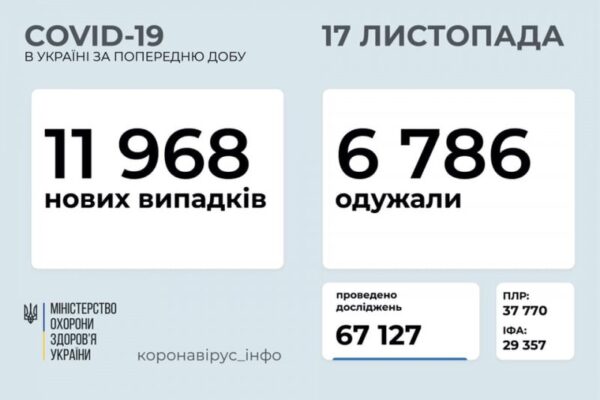 Станом на 17 листопада в Україні зафіксовано 11 968 нових випадків коронавірусної хвороби COVID-19. Зокрема, захворіли 516 дітей та 565 медпрацівників.