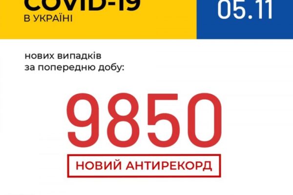 За минулу добу в Україні зафіксовано 9850 нових випадків коронавірусної хвороби COVID-19 (з них дітей – 369, медпрацівників – 514).