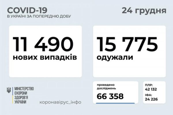 11 490 нових випадків коронавірусної хвороби COVID-19 зафіксовано в Україні станом на 24 грудня 2020 року. Зокрема, захворіли 488 дітей та 445 медпрацівників.
