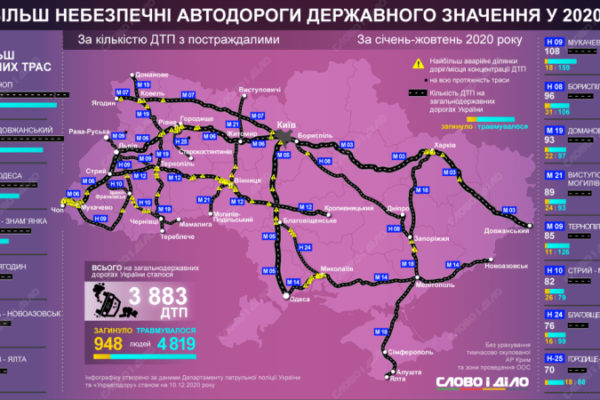 Назвали 15 автодоріг державного значення, де сталося найбільше ДТП від січня по жовтень 2020 року. У переліку – дві траси, які пролягають через Волинь.