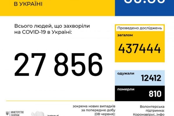В Україні зафіксовано 27856 випадків коронавірусної хвороби COVID-19.