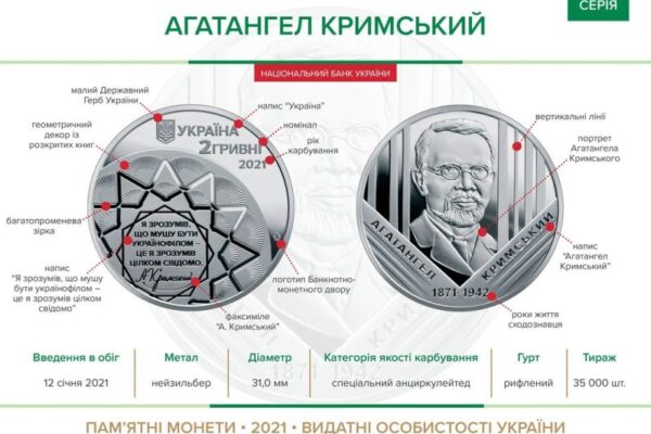 12 січня 2021 року Національний банк у продовження серії “Видатні особистості України” вводить в обіг пам’ятну монету “Агатангел Кримський”.