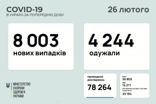 Станом на 27 лютого в області зареєстрували 182 нових випадків інфікування коронавірусом.