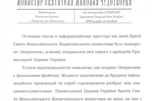 Ченці Жидичинського монастиря ПЦУ повідомили, що від їхнього імені в інформаційному просторі було поширене фейкове «Звернення».