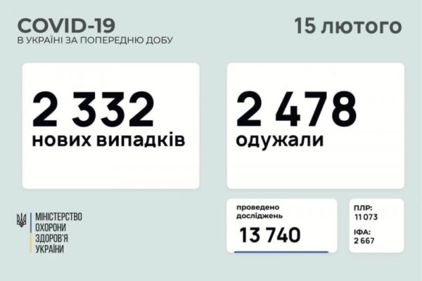 2 332 нових випадків коронавірусної хвороби COVID-19 зафіксовано в Україні станом на 15 лютого 2021 року. Зокрема, захворіли 160 дітей та 47 медпрацівників.