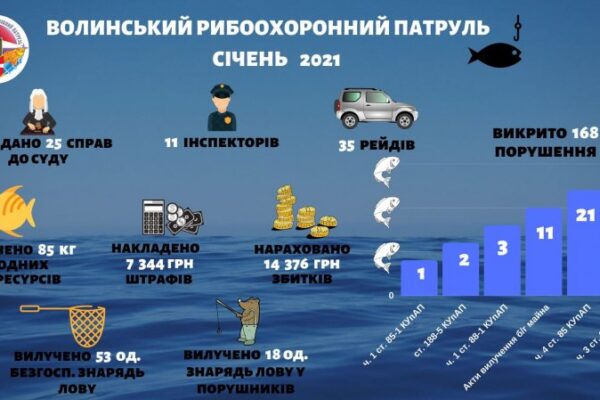 У період з 1 по 31 січня державними інспекторами Волинського рибоохоронного патруля проведено 35 рибоохоронних рейдів та викрито 168 порушень природоохоронного законодавства, з яких 21 – грубих (ч. 4 ст. 85 КУпАП). Також складено 130 протоколів за ч. 3 ст. 85 КУпАП (порушення Правил рибальства), три – за ч. 1 ст. 88-1 КУпАП (незаконне придбання чи збут водних біоресурсів), два – за ст. 188-5 КУпАП та один – за ч. 1 ст. 85-1 КУпАП (продаж заборонених знарядь лову).