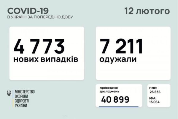 Станом на 12 лютого в Україні зафіксовано 4 773 нових випадків коронавірусної хвороби COVID-19. Зокрема, захворіли 326 дітей та 212 медпрацівників.