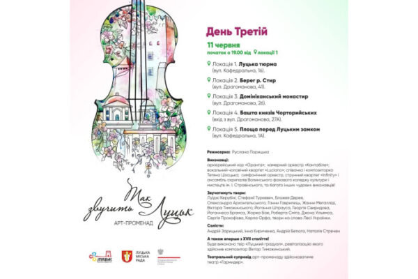 11 червня відбудеться третій день арт-променаду «Так звучить Луцьк». Організатори – управління туризму та промоції міста Луцької міської ради – запрошують у мандрівку відомим і невідомим Луцьком! Захід розпочнеться о 19.00 з вул. Кафедральна, 16 (приміщення Луцької тюрми).