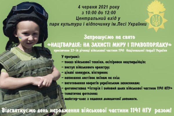 4 червня у Центральному парку культури і відпочинку Луцька з 10 до 12 години відбудеться свято для лучан та гостей міста, присвячене 27-ій річниці військової частини 1141 Національної гвардії України.