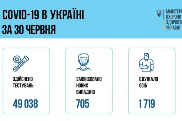 За добу 30 червня 2021 року в Україні зафіксовано 705 нових підтверджених випадків коронавірусної хвороби COVID-19 (з них дітей – 28, медпрацівників – 18).