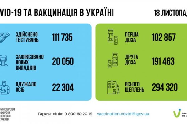 За добу 18 листопада в Україні зафіксовано 20 050 нових підтверджених випадків коронавірусної хвороби COVID-19 (з них дітей – 1555, медпрацівників – 331).
