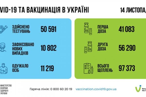 За добу 14 листопада в Україні зафіксовано 10 802 нові підтверджені випадки коронавірусної хвороби COVID-19 (з них дітей – 764, медпрацівників – 132).