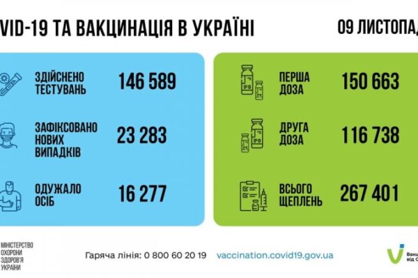 За добу 09 листопада в Україні зафіксовано 23 283 нові підтверджені випадки коронавірусної хвороби COVID-19 (з них дітей – 1 539, медпрацівників – 529).