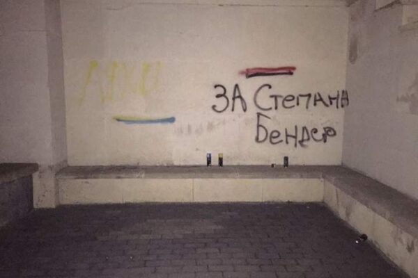 Провокатори встигли зіпсувати частину меморіалу стилізованими малюнками синьо-жовтого і чорно-червоного прапорів та написами.