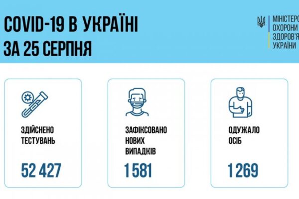 За добу 25 серпня 2021 року в Україні зафіксовано 1 581 новий підтверджений випадок коронавірусної хвороби COVID-19 (з них дітей – 104, медпрацівників – 38).