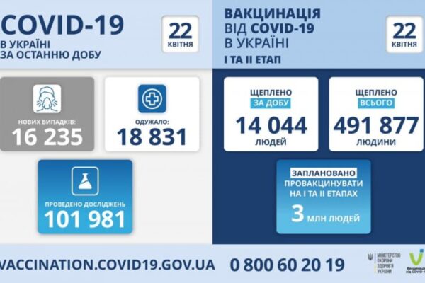 Станом на 22 квітня в Україні зафіксовано 16 235 нових випадків коронавірусної хвороби COVID-19. Зокрема, захворіли 663 дитини та 319 медпрацівників.