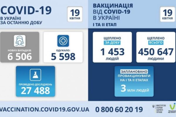 Станом на 19 квітня в Україні зафіксовано 6 506 нових випадків коронавірусної хвороби COVID-19. Зокрема, захворіли 253 дитини та 98 медпрацівників.