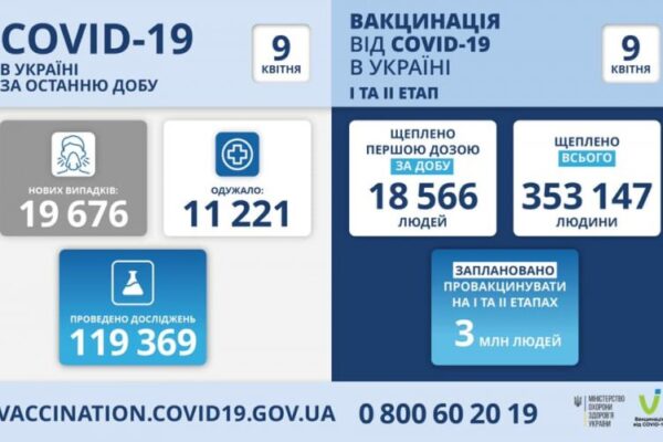 Станом на 9 квітня в Україні зафіксовано 19 676 нових випадків коронавірусної хвороби COVID-19. Зокрема, захворіли 751 дитина та 552 медпрацівники.