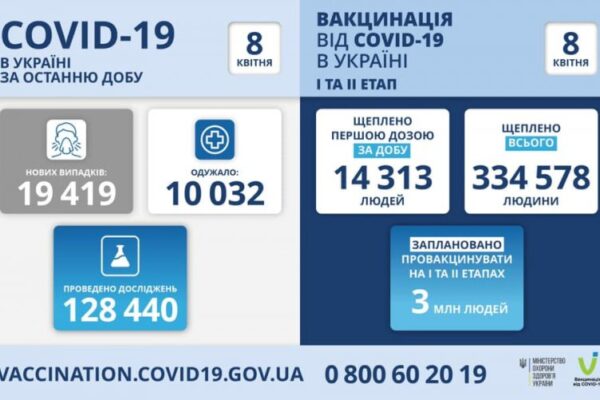 Станом на 8 квітня в Україні зафіксовано 19 419 нових випадків коронавірусної хвороби COVID-19. Зокрема, захворіли 766 дітей та 480 медпрацівників.