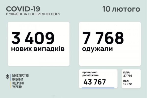 Станом на 10 лютого в Україні зафіксовано 3409 нових випадків коронавірусної хвороби COVID-19. Зокрема, захворіли 244 дитини та 298 медпрацівників.