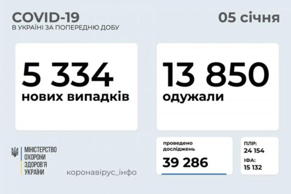 5 334 нових випадки коронавірусної хвороби COVID-19 зафіксовано в Україні станом на 5 січня 2021 року. Зокрема, захворіли 164 дитини та 362 медпрацівники.